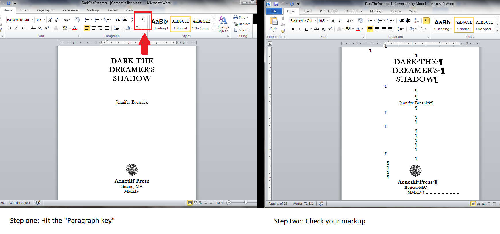 This is the worst. When I wrote my first book, The Last Death of Tev Chrisini, I did it in Google Docs. Boy, was that a mistake. I had to go through each and every paragraph, line by line, and change all the “tabs” to actual paragraph breaks, remove all the four-space blocks I used to start new lines, learn how to use page breaks and section breaks and figure out what orphans and widows were and how to kill them. It was not fun.