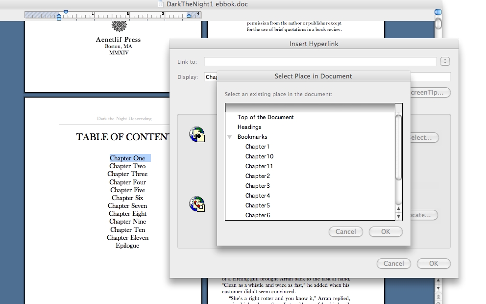 There are two main technical tasks for creating a table of contents. The first is to bookmark your chapter headings.