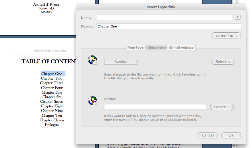 I’m sure you’ve all added hyperlinks to something at some point in your lives, so this isn’t going to be that complicated. To link Chapter One to its bookmark in the text, highlight “Chapter One” in your table of contents: