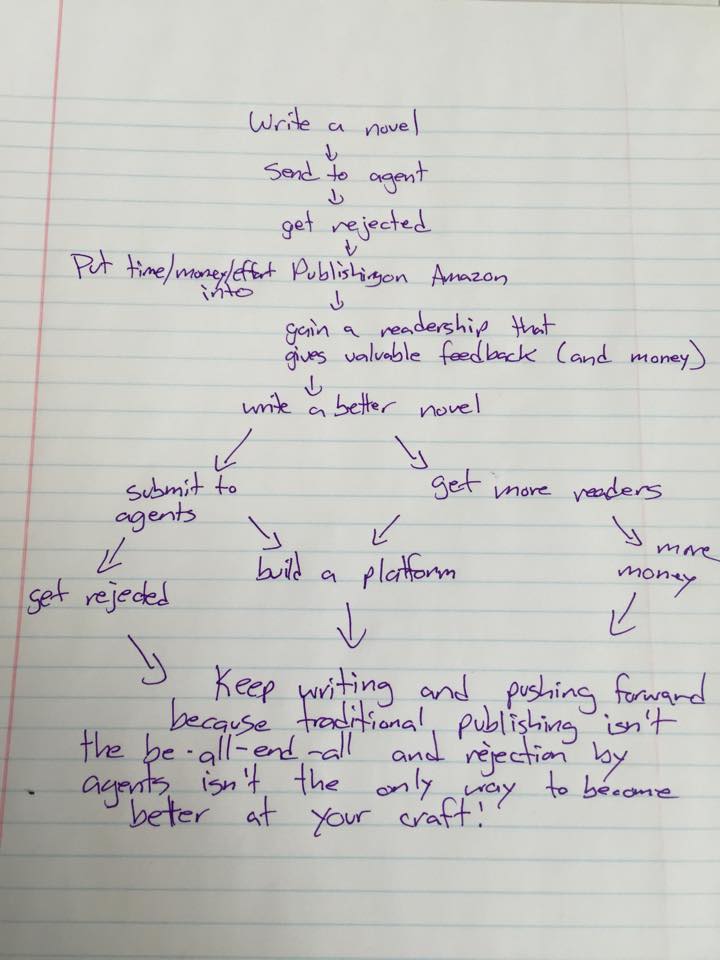 Now, if you can get past the poor handwriting (and the fact that maybe it implies the use of readers as guinea pigs, which was not what I meant), you can see that a) the path that leads an author into self-publishing can be a little more complex than a single rage-inducing rejection, and b) the path that develops after self-publishing can lead to any number of amazing things.
