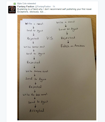 First of all, despite the assertion that there are exceptions to what he obviously believes is a rule, the flow of this chart is insultingly reductive. Let’s establish one thing as the basis for all the arguments to follow: Self-publishing does not equal giving up.